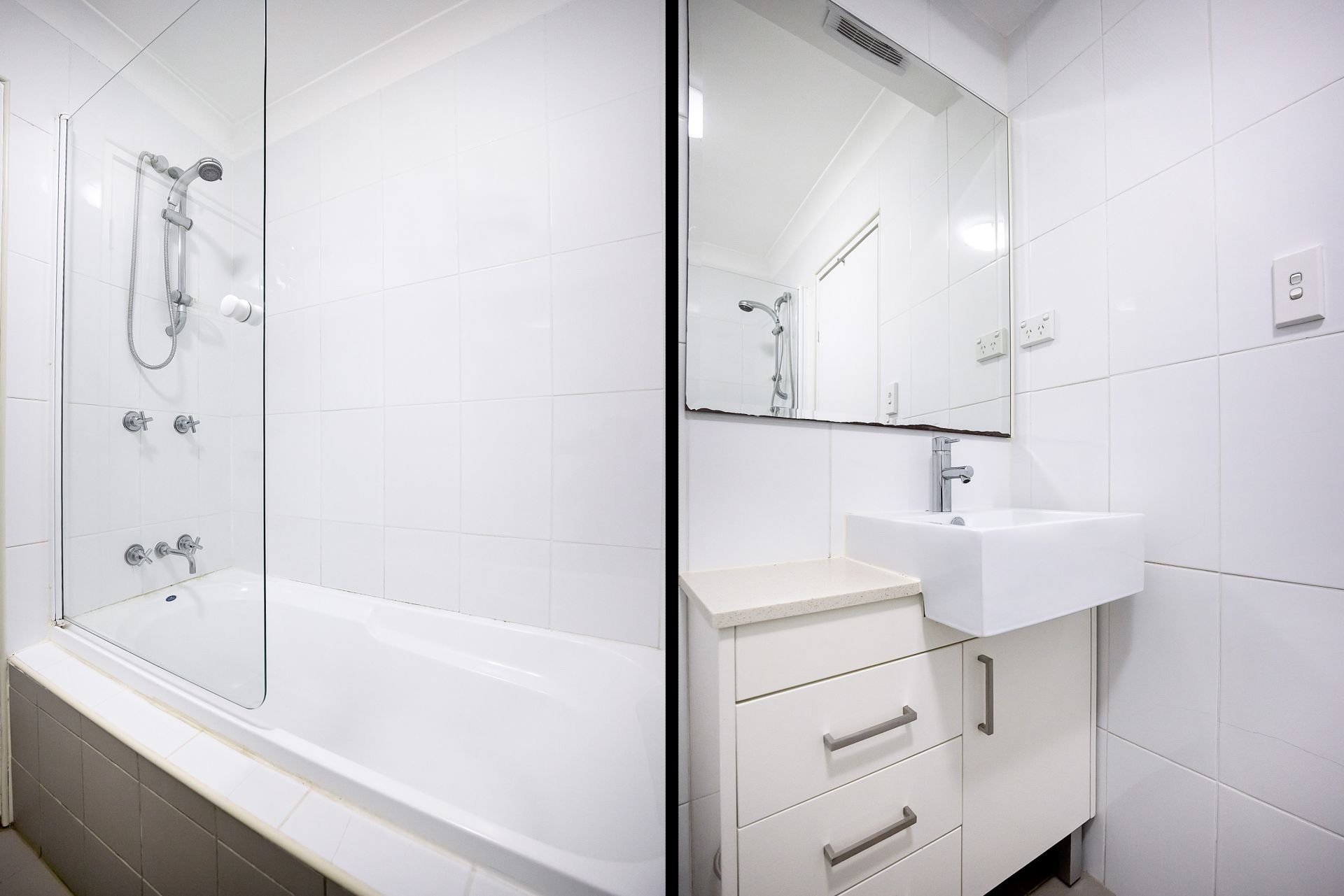 - Fully tiled bathroom with shower over bath, discrete internal laundry